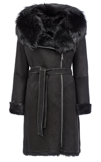 Дубленка от Московской фабрики GRAFINIA изготовлена из высококачественного меха ягненка мерино с лазерным покрытием. Отделка мехом чернобурки по капюшону. Детали: приталенный крой, кожаный ремень, два боковых кармана. Есть возможность застегнуть под гор...