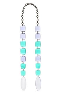 Длинное голубое колье поможет разнообразить повседневный гардероб. Для изготовления модели мастера марки использовали текстильные шнуры, на которых закрепили крупные матовые бусины и плоские детали из эпоксидной смолы, стилизованные под фрагменты фактур...