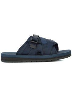 Темно-синие шлепанцы с ремешками и пряжкой от Prada. Открытая модель без застежки, ремешки с застежкой на пряжку спереди, фирменная стелька, плоская подошва.