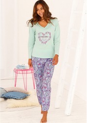 Пижама. Модный бренд Buffalo представляет очаровательную пижаму из одностороннего хлопкового джерси, которая обеспечит Вам сладкие сны! Верх украшен глубоким V-образным вырезом и милым принтом в виде сердечка. Длинные брюки с удобным эластичным поясом и...