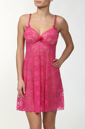 Сорочка, полотно сорочки из эластичной микрофибры, лиф мягкий из чёрного кружевного полотна и сетки, спереди и на спинке кружево продублировано тканью цвета фуксии, бретели регулируются по длине, под грудью пришита широкая эластичная резинка.
