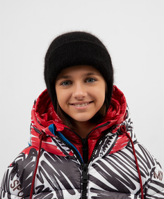 Стильная шапка, связанная в два слоя, - красивое завершение осенне-зимнего образа девочки. Благодаря цветному металлизированному напылению шапка выглядит очень необычно, интересно, свежо. В оформлении модели использован резиновый патч с шрифтовыим элеме...
