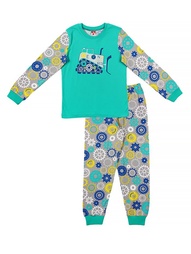Пижама для мальчика, из комбинации набивного и гладкокрашенного полотна. Принт на передней полочке. Рукава и брюки на манжете.