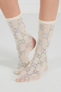 Носки из белого сетчатого трикотажа от Gucci. Пара декорирована сверкающими кристаллами, которые выложены в виде фирменной сетки GG Web. Верх с плотной окантовкой. Состав: 80% полиамид, 20% эластан
