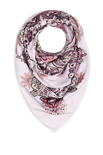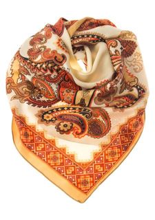 Шелковистый платок с легким атласным блеском декорирован узором пейсли в теплых тонах. По краям широкий бордюрный принт с графическим орнаментом. Сочетается и с элегантной, и с непринужденной одеждой.