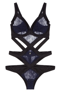 Боди из коллекции бренда Agent Provocateur. Модель выполнена из тонкого темно-синего кружева и дополнена перекрещенными лентами насыщенного черного цвета. Мягкая чашка, глубокие вырезы по бокам, регулируемые бретели. Состав: кружево основной состав: 10...