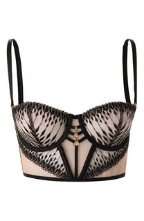 Бюстье из коллекции Tierra выполнили из атласных лент и стрейчевого тюля на основе нейлона. Белье с прозрачными вставками на чашечках, дополненных косточками, украсили графичной вышивкой. Модель оттенка Morello, с фурнитурой, покрытой 24-каратным золото...