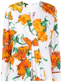 Блузка с цветочным принтом и запахом от Escada. Цветочный принт, перед с запахом, деталь со складками, V-образная горловина, длинные рукава и застежка на молнии сзади. Цвет: белый.