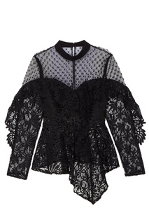Черная ажурная блузка Self-Portrait с комбинированным дизайном. Модель с посадкой по фигуре выполнена из кружевной ткани и полупрозрачной сетки. Крупная оборка спереди и по бокам, высокий воротник с плотной отделкой. Длинные рукава, линия низа с асиммет...