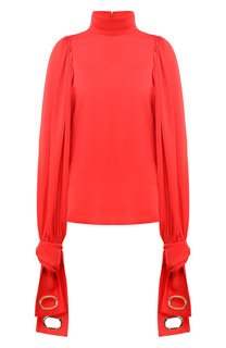 Блуза с высоким воротником от бренда Self-Portrait сшита из однотонного сатина яркого красного цвета. Боковые проймы оформлены свободными рукавами-буф с объемными складками. Манжеты украшены крупными золотистыми люверсами и длинными декоративными лентам...