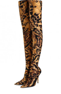 Ботфорты-чулки Knife с высокой шпилькой и зауженным мысом сшиты из эластичного гладкого спандекса с тигровым принтом. Внутри обуви — вставка из гибкого пластика, поддерживающая свод стопы. Сапоги вошли в весенне-летнюю коллекцию марки, основанной Кристо...