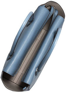 Кожаная сумка-тоут с короткими ручками и съемным плечевым ремнем с регулировкой длины. Мягкий корпус небесно-голубого оттенка дополнен фактурными коричневыми вставками. Аксессуар декорирован подвеской с маленьким металлическим замком и золотистым логоти...