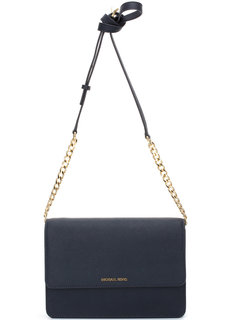 Логотип бренда, основанного Майклом Корсом, украшает клапан сумки, сшитой из плотной сафьяновой кожи синего цвета. Аксессуар с регулируемым по длине плечевым ремнем-цепочкой вошел в осенне-зимнюю коллекцию 2015 года.