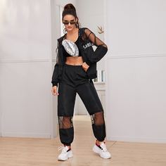 Чёрный Спортивный Длинный рукав Полиэстер буква Неэластичный Весна/Лето Комплект из двух предметов, size features are:Bust: ,Length: ,Sleeve Length:Длинный рукав