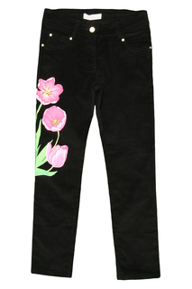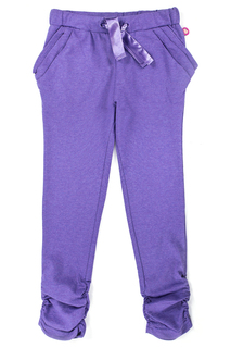 Трикотажные брюки с резинкой в поясе, завязки из атласной ленты. Карманы спереди, по бокам отделка, на брючинах манжеты-резинки.
