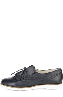 Туфли из весенне-летней коллекции 2016 года дополнены бахромой и бантом. Для изготовления модели с закругленным мысом, на низком квадратном каблуке использована матовая гладкая кожа синего цвета. Обувь на контрастной белой подошве декорирована орнаменто...