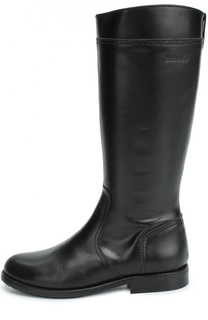 Сапоги из матовой черной кожи вошли в осенне-зимнюю коллекцию 2016 года. Модель дополнена эргономичной колодкой, обеспечивающей точную посадку по ноге. Голенище, украшенное тиснением в виде логотипа марки, застегивается на боковую молнию.