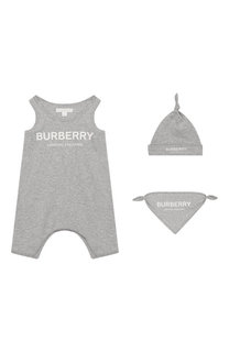 Для создания светло-серого комбинезона с короткими шортами мастера марки использовали мягкий, хорошо пропускающий воздух хлопок в клетку. Орнамент повторяет графический рисунок, придуманный Томасом Берберри в 1924 году. Модель без рукавов, с круглым выр...