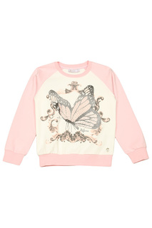 Свитшот из френч терри, с длинными принтованными рукавами и принтом со стразами. Спинка черного цвета. Горловина, низ рукавов и изделия обработаны рибаной в контрастную полоску.