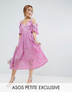 Платье для миниатюрных ASOS PETITE, Кружевная ткань, Открытые плечи, Оборки, Застежка-молния, Классический крой, точное соответствие размеру, Машинная стирка, 40% полиамид, 31% хлопок, 29% вискоза, Размер на модели: UK 8/EU 34/US 4, Длина платья миди: о...