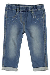 деним, одноцветное изделие, эффект поношенности, эффект "делаве", классическая посадка на талии, светлый деним, застежка спереди, молния и пуговицы, один карман, стразы, контрастные аппликации, низ с отворотом, прямой крой брючин