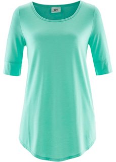 Прохладные вискозные футболки одерживают неоспоримую победу в жаркие летние дни, например вот эта очаровательная удлиненная футболка облегающего силуэта с круглой горловиной, со скругленным нижним краем и рукавами до локтя с имитацией манжет. Футболка о...