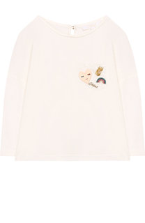 Белый цвет задает тон лонгсливу с круглым вырезом, но от этого он не выглядит скучно. Все дело в красочном декоре на небольшом кармане: аппликация в виде сердца, вышитые радуга и логотип бренда, а также ветвь, выложенная золотистым стеклярусом, добавляю...