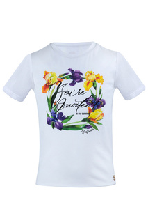Футболка из трикотажа и сетки. На полочке принт на сетке. Футболка А-силуэта, рукав втачной. Горловина, рукав, низ изделия обработаны рибаной. В горловину втачена бейка. Низ декорирован кружевом. На полочке водный принт - надпись и бант.