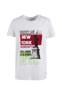 Трикотажная футболка. По горловине изделия контрастная рибана. На полочке резиновый принт. Пришивное лого.