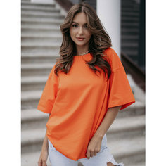 Принт с логотипом на груди, круглый вырез, короткие рукава и прямой подол. Цвет: оранжевый.