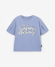 Голубая футболка привнесет в детский образ нежность, свежесть, обаяние. Футболка выполнена из тонкого трикотажного полотна с эластаном. Спущенное плечо, форма оверсайз создают модный комфортный объем. Крупный контрастный принт и деликатная нашивка на сп...
