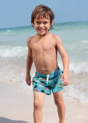 Эластичный пояс с завязывающимся шнурком. Интегрированные плавки. Принт увеличивается от размера к размеру.