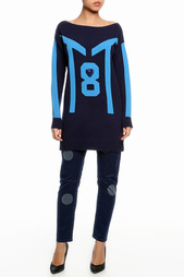 Молодежный трикотажный джемпер с вырезом лодочкой, рукавами 3/4, с необработанными краями и двумя декоративными карманами. Длина спинки 58 см.