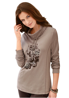 Элегантно-непринужденная кофточка с длинными рукавами и широким воротником-гольф выполнена из мягко струящегося джерси. Фронтальная часть с трикотажным эффектом декорирована оригинальным узором и блестящими стразами. Линия плеч сильно занижена. Прямой с...