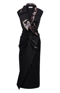 Дизайн этого платья из коллекции бренда Viktoria Irbaieva решен в стиле 80-х. Запах, образующий глубокий V-вырез, фиксируется поясом на талии. А черная ткань с жаккардовым золотистым узором завершает эффектный образ. Носите как вариант для выхода в свет...