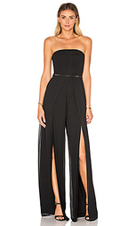 Комбинезон прилегающего силуэта. <br> Изделие отрезное по линии талии.<br> Пояс декорирован тесьмой из страз.<br> Брюки широкие. <br> V-образный вырез по спинке.<br> Потайная застежка молния расположена в среднем шве спинки...