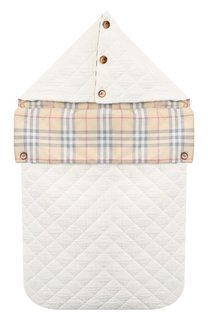 Белый конверт сшит из мягкого стеганого хлопка. Подкладка и широкий отворот выполнены из гипоаллергенной ткани в знаковую для марки клетку (Томас Берберри придумал ее в 1924 году). Объемный капюшон застегивается на три крупные пуговицы. Благодаря длинно...