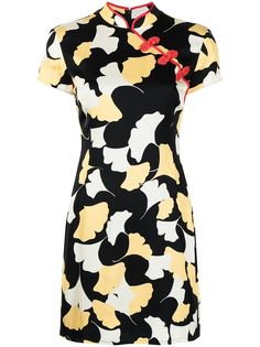 Воротник-стойка, пуговичная застежка сбоку, короткие рукава и длина выше колена.
