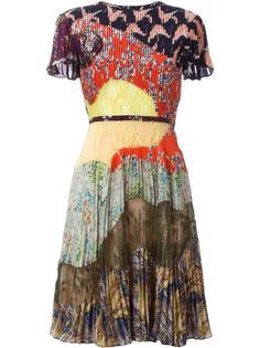 Разноцветное шелковое платье с комбинированным принтом от Valentino. Плиссированный дизайн, круглый вырез, короткие рукава, потайная застёжка на молнии сзади.
