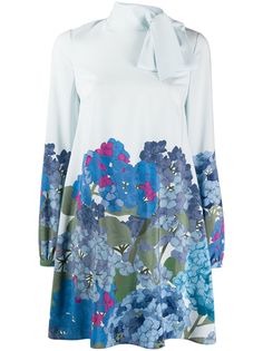 Платье мини Macro Ortensia от Valentino (Валентино). Длинные рукава, цветочный принт, потайная застежка на молнии сзади, короткая длина, бант спереди и узкие манжеты.