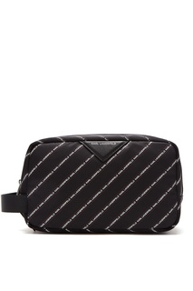 Косметичка выполнена из фактурного материала черного цвета. Аксессуар оформлен сплошной контрастной отделкой в полоску в виде мини-логотипов бренда. Модель спереди украшена треугольной деталью с надписью. Состав: 91% полиамид,9% кожа