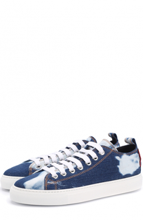 Голубые джинсовые кроссовки из хлопка и телячьей кожи украшенные патчами от Dsquared2(Дискваред). Плоская резиновая подошва, модель слип-он, без застежки, фирменная стелька, эффект потертости, закругленный носок. Состав: Кожа теленка/Кожа/Хлопок/Резина