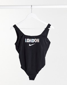 Слитный купальник Nike Прекрасный вариант для плавания Квадратный вырез горловины Съемные перфорированные чашечки Голографическая надпись "London" и принт логотипа Nike Глубокий вырез на спине Крой с закрытыми ягодицами