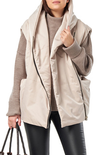 Жилетка из плотной плащевой ткани с утеплителем Термофинн. Детали: шалевый воротник переходящий в капюшон, широкий запах по переду, объемные карманы, застежка на декоративную молнию.