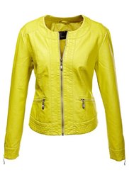Куртка из красивой мягкой искусственной кожи. Модель на застежке-молнии, с круглым вырезом горловины и карманами на молниях. Длина от 56 см (разм. 34) до 63 см (разм. 48). Машинная стирка. Верх: 100% полиуретан. Подкладка: 100% полиэстер.