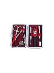 Маникюрный набор в металлическом корпусе прямоугольной формы. В набор входят 10 предметов: кусачки для маникюра, кусачки для педикюра, ножницы для кутикулы, ножницы для ногтей, два двухсторонних пушера, пинцет, металлическая пилочка, триммер на пласти...