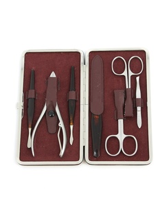 Инструменты: ножницы для ногтей, ножницы для кутикул, шабер "лопатка", шабер "копье", шабер острый, пилка-металл, пинцет наклонный, кусачки для кожи; покрытие - никель. Маникюрный набор Dewal предназначен для создания безупречного маникюра и педикюра