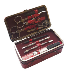 В кожаном футляре с металлическим каркасом на защелке — маникюрные инструменты из закаленной стали, покрытые никелем и золотом. Их заточенные и отшлифованные вручную рабочие поверхности надолго сохранят свою остроту. Две пары ножниц и щипцов (для ногтей...