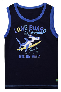 Состав: 100% хлопок. Майка для мальчика из однотонного ластика, горловина и проймы обработаны бейкой, бочки из отделочного полотна, в шве бочка кант, печать.