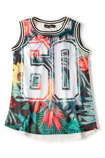 Изумительный топ для юной модницы. Выполнено изделие из хлопковой ткани с эффектным ярким принтом. Вырез горловины, пройма и низ декорированы хлопковым кружевом. Спереди имеется застежка на пуговицы. Низ топа собран на резинку.